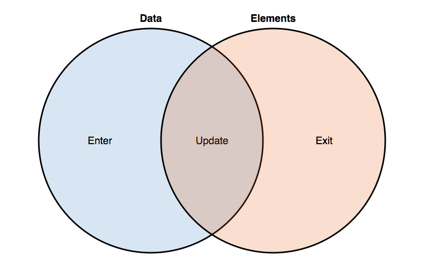 D3 utilise 3 fonctions: enter(), update(), et exit(). Pour connecter des actions de dessin, à des changements dans les données.